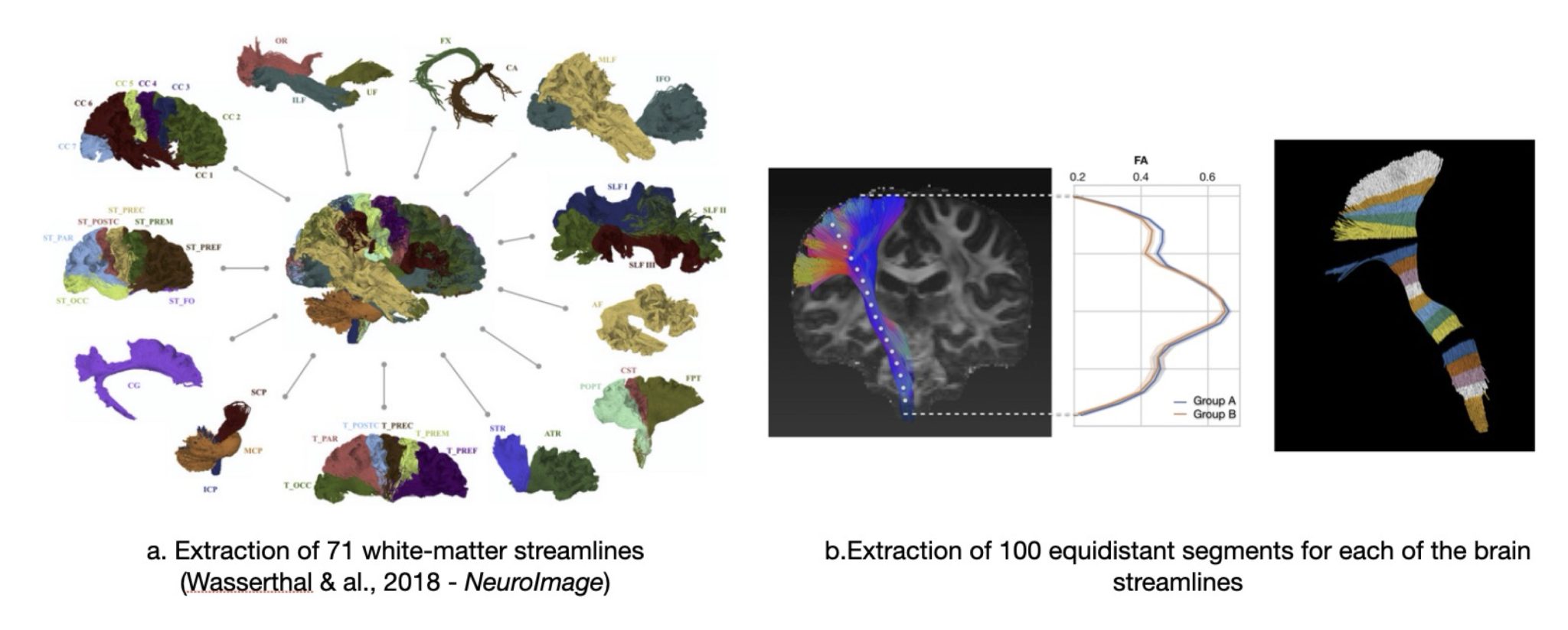 - Tractography-based segmentation using TractSeg (Wasserthal et al., 2018, NeuroImage; see Figure above) identifying 71 major white matter tracts