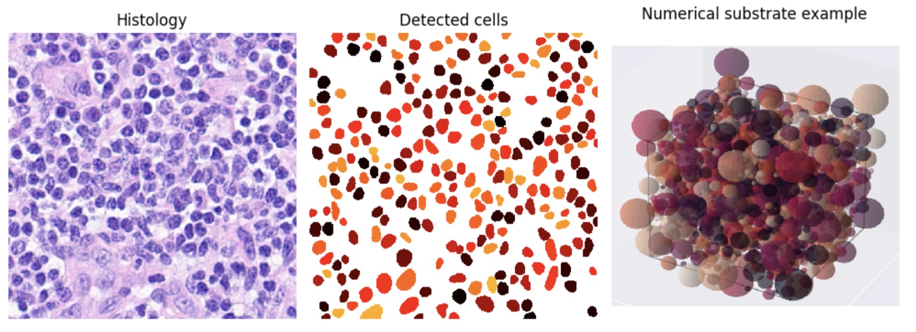 Lymph nodes are essential organs of the body’s immune system. They are one of the first organs to be reached by metastasis in case of primary cancer in another organ and their involvement is used by clinicians for cancer staging. In the context of our research within LTS5, we aim at deciphering the microstructural information encoded in diffusion-weighted magnetic resonance imaging (DW-MRI) signal of lymph nodes, to find biomarkers differentiating a metastatic microenvironment from a healthy one. To validate our method, we generate tissue-mimicking numerical substrates and compute their numerical DW-MRI signal using MCDC [1] [see Project 3 for more details]. The first step for this is having an accurate characterization of both healthy and metastatic lymph nodes composition in order to generate numerical substrates which match as closely as possible real lymph nodes tissues. Segmenting histology images of lymph nodes cuts provides a way to compute statistics about cells populations, density and metastatic invasion.