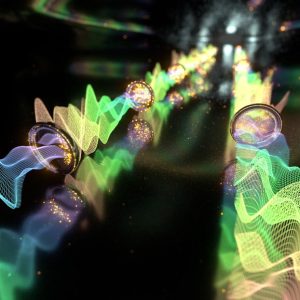 Artistic illustration of sound waves passing through series of scattering objects, yet being unaffected in amplitude thanks to active elements.