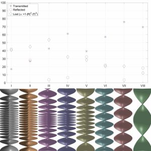 Metasurface prototype achieving Orbital Angular Momentum. Illustration on how the metasurface allows spinning acoustic wavefronts.Setup to assess the Acoustic Metasurface achieving Orbital Angular Momentum (OAM).Space-coiling labyrinthine acoustic channel used for designing an Acoustic Metasurface with graded transmission phase.Principle of a metasurface unit-cell composed of membrane-capped small cavities. The membrane thickness allows adjusting the reflection coefficient phases of each unit, to obtain a prescribed grating over the metasurface, eventually breaking the Snell-Descartes law of reflection.Illustration of the acoustic carpet-cloak, achieved with an ultra-thin metasurface made of an arrangement of membrane-capped small cavities.Prototype of an artificial acoustic prism, consisting of a 1D acoustic waveguide loaded by a periodic arrangement of thin plates, and side channels allowing sound to leak out.Illustration of the acoustic prism effect. A sound source placed at the left extremity of the host waveguide leaks out towards the surrounding medium along frequency-dependent directions.Artistic illustration of sound waves passing through series of scattering objects, yet being unaffected in amplitude thanks to active elements.Principle of an acoustic metamaterial achieving non-reciprocal harmonic conversion in real sounds