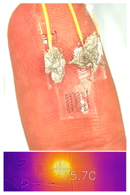 In this project, we fabricated and tested an untethered flexible electronic implant for neural stimulation. The device comprises of an on-board antenna for harnessing electromagnetic power and a serpentine-shape printed wire embedded in a flexible elastomer that heats upon application of electrical current. The deposition of silver-based paste was performed with a custom-made 3D printing system involving a pneumatic dispenser and a computer-controlled linear positioner. The heater successfully reached more than 70°C in just a few seconds and at a few cm distance from the electromagnetic emitter. |