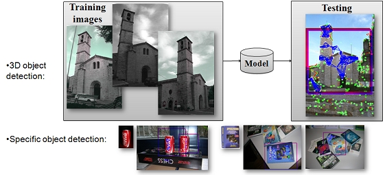 During the training phase, a set of images of the target object (from different views, and with eventual deformations) is processed. First, features are extracted from the training images. To resolve the localization problem efficiently, we use accurate sparse features detector and descriptor. Hessian affine detector and SIFT affine invariant image descriptors are extracted. Hierarchical clustering is then applied in the feature space to increase the efficiency of the matching process.