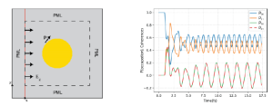 This project focuses on a self consistent modeling f ramework for the coupled Maxwell Bloch equations using the open source finite difference time domain (software MEEP) By extending MEEPâs capabilities to integrate the Bloch equations alongside electromagnetic field evolution, the approach enables the simulation of realistic scenarios where light dynamically influences quantum emitters and, in turn, emitters alter the electromagnetic fields. The framework will allow for the study of single and collective emitter dynamics in complex photonic env ironments, enabling investigations into coherence phenomena, and energy transfer at the nanoscale. The resulting tool will provide both methodological advances and practical guidance for the design of nanophotonic and quantum technologies.