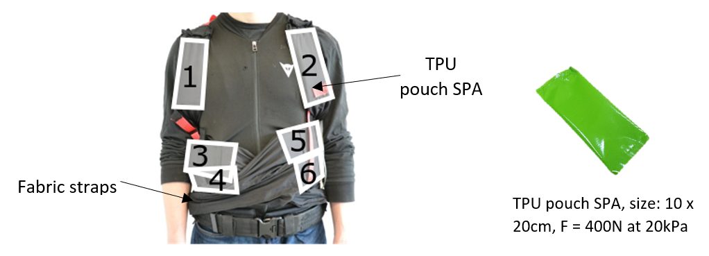 Fig. 1: Current prototype of the soft exosuit for forward support. It consists of TPU pouch SPAs shown in the last image.