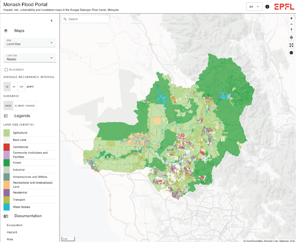 Many countries, including Switzerland and Malaysia, have recognised the importance of improving their flood management to minimise the hazards to human lives, property, and the environment. There is a clear need for an interdisciplinary effort for collaborative learning across research facilities, municipalities, and governments. Therefore, the main aim of our project was to develop a public flood web viewer to visualise the integrated flood risks in the Selangor River catchment study area under different scenarios, such as changes in land use and climate change projections. The web viewer (see screenshot above) is online at: https://monash-flood-portal.epfl.ch/