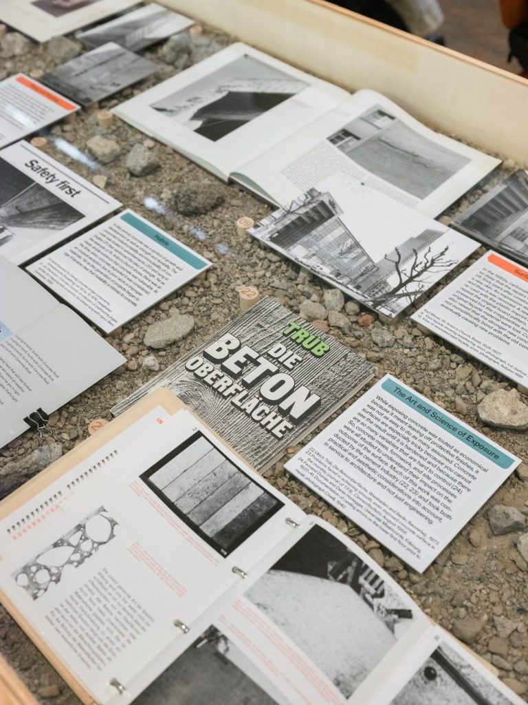 Many of these structures suffer from degradation, particularly when exposed (cracking, spalling, streaking, etc). We would like to argue that this is the result of a particular mindset, one that believed concrete to be both under control and immutable, despite ample recurring evidence to the contrary. To untangle this, we will look at the construction of the idea of control and immutability through advertising and material science. A film documenting concrete practices like ‘Betonkosmetik‘ will illustrate the degradation and possibilities of repair of this material, along with physical concrete samples, and tools of repair. Through archival documents, we will show that there have been continuous attempts at concrete repair over the past decades, demystifying the myth of its immutability. We will finally focus on the fragile hardness of the concrete surface, looking at how and how it is vulnerable, why it is an important site of care, and what possible practices might take better account of its vulnerability.
