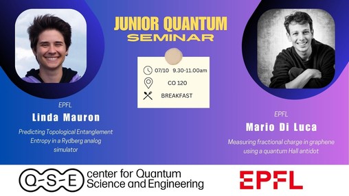 Past events QSE Quantum Seminar: "Demonstrating high-fidelity operations using dual-rail cavity erasure qubits" 05.02.2026 12:0013:30Speaker: Nitish MehtaLocation: CE 1 105Category: Conferences – SeminarsTarget audience: General publicSpin shuttling – a new paradigm for semiconductor spin qubits 26.01.2026 16:1517:15Speaker: Prof. Lieven Vandersypen, Delft University of TechnologyLocation: BM 5202Category: Conferences – SeminarsTarget audience: General publicQuantum IC Seminar : "Sampling probability bounds from bosons" 21.01.2026 11:0012:00Speaker: John BostanciLocation: BC 010Category: Conferences – SeminarsTarget audience: General publicQSE Quantum Seminar: "Separating QMA from QCMA with a classical oracle" 19.01.2026 12:0013:30Speaker: John BostanciLocation: CE 1 104Category: Conferences – SeminarsTarget audience: General publicQSE Quantum Seminar: "Cooling a Qubit using n Others" 15.01.2026 12:0013:30Speaker: Jake XuerebLocation: CE 1 105Category: Conferences – SeminarsTarget audience: General publicJunior Quantum Seminar – Marco Scigliuzzo & Aleksei Gaier 18.11.2025 09:3011:00Speaker: Marco Scigliuzzo and Aleksei GaierLocation: CE 1 100Category: Conferences – SeminarsTarget audience: Informed publicIEM Seminar Series: One Photon at a Time – CMOS SPAD Imagers for Scientific Applications 18.11.2025 17:1518:00Speaker: Claudio BruschiniLocation: ELA 2 & OnlineCategory: Conferences – SeminarsTarget audience: General publicQSE Quantum Seminar: Mini algorithms-fest – John Martyn and Jonathan Lu 13.11.2025 12:0014:00Speaker: John Martyn Jonathan LuLocation: BS 160Category: Conferences – SeminarsTarget audience: General publicA Simple Introduction to Quantum Computing and its Applications 03.11.2025 12:0014:00Speaker: Prof. Ignacio CiracLocation: Forum RolexCategory: Conferences – SeminarsTarget audience: General public"Quantum Readiness at Global Scale: Securing Billions of Systems for the Quantum" 03.11.2025 18:0020:00Speaker: Marc Ph. StoecklinLocation: Forum RolexCategory: Conferences – SeminarsTarget audience: General publicQSE Quantum Seminar, "Topological pumping and quantum information processing" – Konrad Viebahn 23.10.2025 12:0013:30Speaker: Dr. Konrad ViebahnLocation: CE 1 105Category: Conferences – SeminarsTarget audience: General publicAtome, énergie, lumière: la quantique pour grand public ! 18.10.2025 10:0017:00Location: SwissTech Convention CenterCategory: Conferences – SeminarsTarget audience: General publicSwiss Quantum Week 13.10.202519.10.2025 08:0018:00Category: Public Science EventsTarget audience: General publicQuantum Mysteries: Understanding, Exploring, Dreaming 09.10.202511.11.2025 Location: Espace DécouverteCategory: ExhibitionsTarget audience: General publicJunior Quantum Seminar – Linda Mauron/ Mario Di Luca 07.10.2025 09:3011:00Speaker: Mario Di Luca and Linda MauronLocation: CO 120Category: Conferences – SeminarsTarget audience: Informed publicSee all events