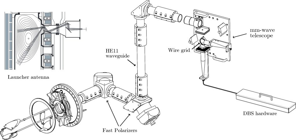 TPCI is complemented by a Short-Pulse Reflectometer (SPR). This is, in short, a radar. Electromagnetic pulses in the microwave range (50-80 GHz) are launched into the plasma. At these frequencies, electromagnetic waves encounter so-called “cutoff” locations, defined by the plasma properties (primarily its density). At these locations, the waves are reflected back. As the waves are in the form of short pulses (less than 1 nanosecond), one can simply measure their time of flight back to the point of departure, which allows one to locate the cutoff layer in space. By constantly scanning the pulse frequencies, a large fraction of the plasma is scanned, and the spatial variation of density can be reconstructed. Furthermore, as the pulses are so short, the scans can be very rapid and fast density fluctuations can also be estimated.