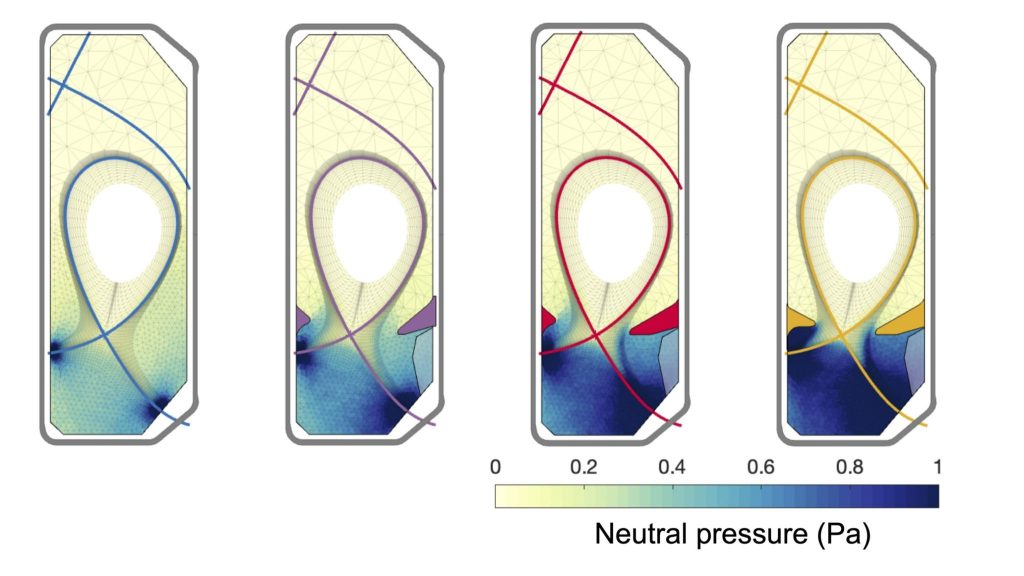 Power exhaust is the management of the heat and particle fluxes escaping from the confined plasma that strikes the reactor walls. Reactor solutions must limit plasma fluxes onto material walls and the plasma in contact with the PFCs must be sufficiently cold, effectively “detaching” the hot core plasma from the plasma-wall interface. This is facilitated by specific plasma shaping of the outer exhaust region of the plasma called the divertor.