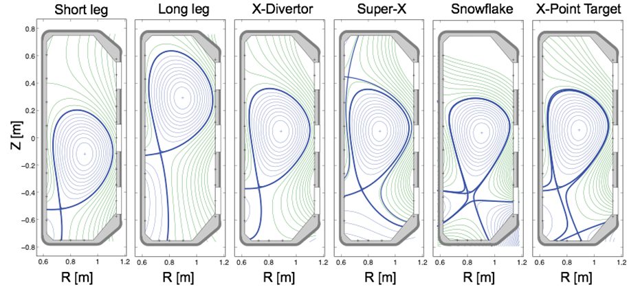 While ITER will test the standard divertor solution in fusion reactor conditions, on TCV, we explore novel ideas, such as alternative magnetic geometries of the boundary plasma. Some of the alternative divertor solutions studied at the Swiss Plasma Center are shown below:
