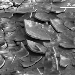 SEM image of the surface of a GdSbTe compound. The surface layer has cracked and bend up similar to soil when it dries out from summer heat. This degradation has only affected the surface layer while the sample underneath remained in tact. The image was taken on the Helios PFIB.