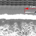 Beauty lies in the eye of the beholder, but sometimes the ugly lies in your sample, staring back at you! An As2Se3 chalcogenide film was thermally evaporated onto a corrugated polymer substrate. The film was then dip-coated for encapsulation. Solvant etched a hole under the corrugated chalcogenide film by error, which was calling for an eye to be photoshopped into it. A cross-section was obtained by cryo-cutting the film in liquid nitrogen at CIME. Observation was made using a wafer section holder in the Gemini SEM.