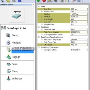 - Peak Force Setpoint : This parameter corresponds to the reactivity of cantilever in contact with a step. You can control it if you switch OFF the ScanAyst Auto Control.