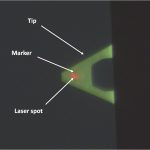 - The marker and the laser have to be aligned because the laser is not always visible on the tip contrary to the marker. Then you can easily move the marker. To do it, (if you see the laser and only if you see the laser) activate the routine Calibrate Laser Position in the sub menu Align Laser (3) (a large red cross appears) and click on the laser and press Save and Return. If you don’t see the laser, click on the edges of the tip to see it. The correct final position of the laser/marker is close to the end of the triangular shape of the tip for ScanAsyst Fluid+ tips.