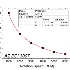 While using a BARC layer will have a positive impact on the photolithography process with any imaging resist, it makes sense to use XHRiC with high-resolution, high transfer accuracy resists such as AZ ECI 3007 or AZ ECI 3027, which are available on the EVG 150 automatic coater and the Sawatec SM-200 manual coater. The spincurves are shown below.