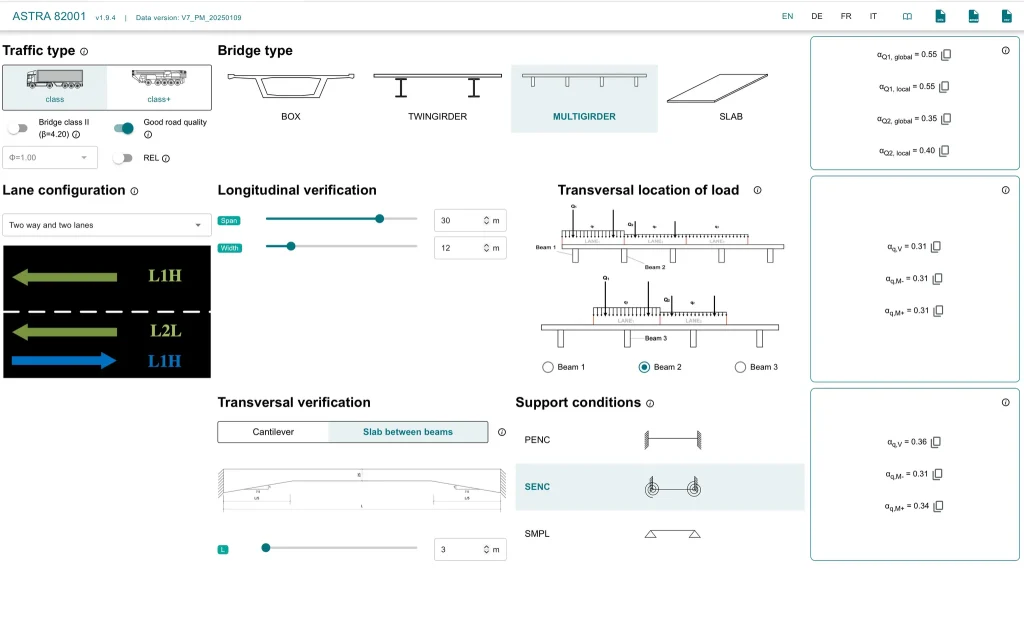 The Bridge Traffic Load Web Calculator (based on norm Astra 82001) is a free online tool that helps engineers analyze bridge safety according to Swiss standards. Developed by ENAC-IT4R and RESSLab for the Federal Roads Office (FEDRO), it’s available in English, French, Italian, and German.