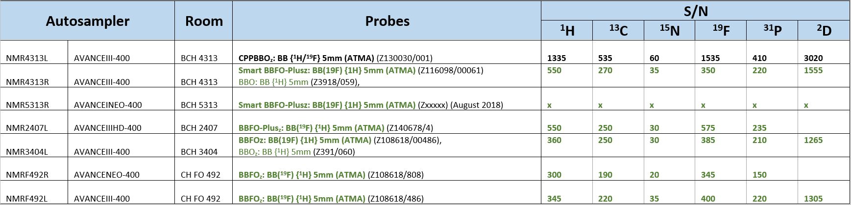All the NMR probes installed on automats are of BBFO type, and thus tuneable over a frequency range that enables observation of nuclei between 31P and 15N, as well as 19F. 1H{19F} decoupled measurements are as well possible. The automat in BCH4313l is equipped with a N2 cooled Prodigy probe increasing its sensitivity by a factor 2, (i.e. factor 4 in measurement time) for 1H, 19F, 13C, and 31P, or other heteronuclei. It can be efficiently used for characterization.