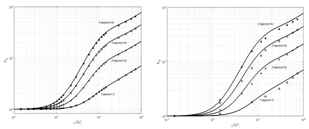 Figure 1: F_R as a function of |α^2 h^2 | for winding portions with integral numbers of layers according to Dowell’s equations and comparison with two (left side) and three dimensional (right side) simulations. Δ the simulation results for m=1, + the results simulation for m=2, ο the simulation results for m=3 and * the simulation results for m=4