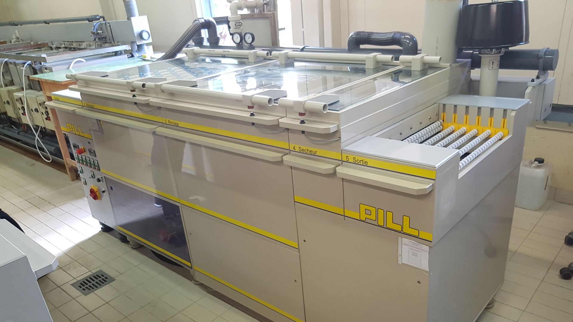 This equipment realizes the development of the photoresist. It removes the non-exposed photoresist by projecting a NaCO3 solution onto the film.